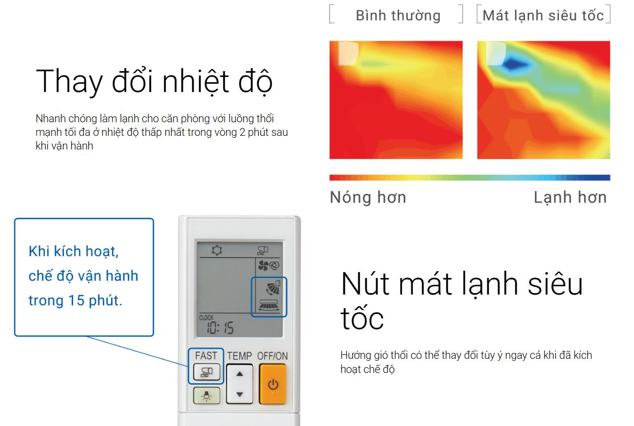 Máy được trang bị công nghệ làm lạnh nhanh, giúp nhiệt độ trong phòng hạ xuống nhanh chóng chỉ trong vài phút sau khi khởi động. Người dùng không còn phải chờ lâu để tận hưởng không khí mát mẻ, đặc biệt là trong những ngày nắng nóng gay gắt.