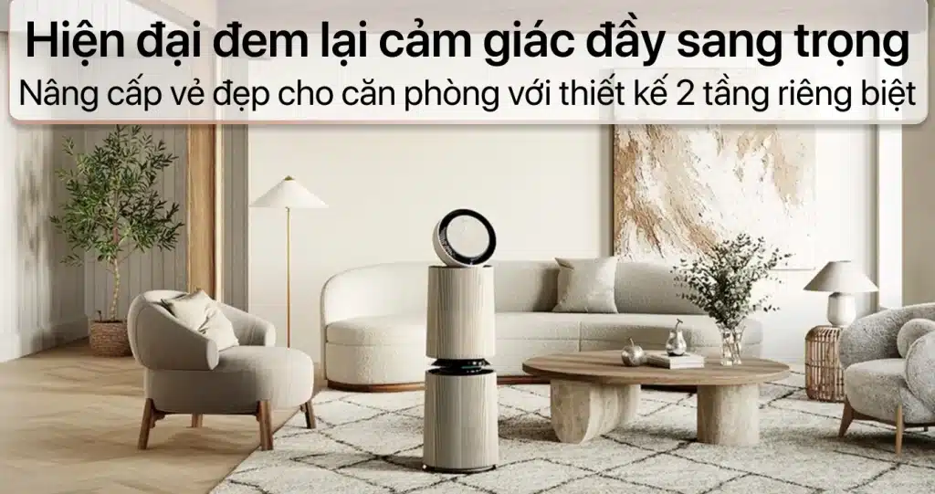 Máy lọc không khí LG PuriCare 2 tầng AS10GDBY0 sở hữu thiết kế tinh tế với hai tầng lọc, vừa tạo điểm nhấn cho không gian sống của bạn vừa nâng cao hiệu quả lọc không khí. Máy có màu trắng thanh lịch, giúp phù hợp với nhiều phong cách nội thất khác nhau. Kích thước nhỏ gọn, dễ dàng di chuyển và lắp đặt ở nhiều vị trí trong ngôi nhà, từ phòng khách đến phòng ngủ.
