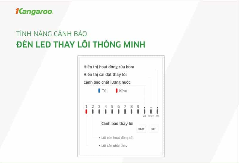 Máy lọc nước nóng lạnh Kangaroo KG10A2I cũng được trang bị hệ thống cảnh báo giúp người sử dụng nhận biết tình trạng hoạt động của máy. Nếu bộ lọc cần thay thế hoặc khi bình chứa nước cạn kiệt, đèn cảnh báo sẽ tự động sáng lên, giúp bạn kịp thời xử lý vấn đề.