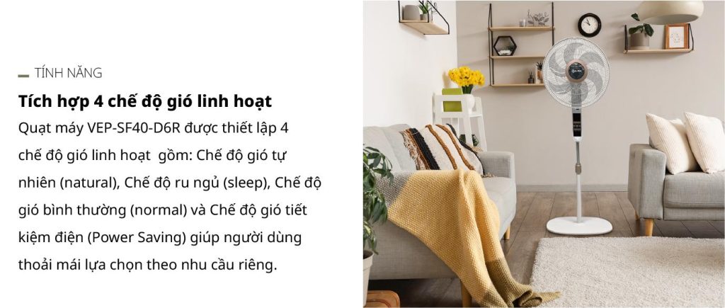 Quạt đứng E-Pro VEP-SF40-D6R được trang bị 4 chế độ gió linh hoạt: cho phép người dùng chọn chế độ phù hợp theo nhu cầu (gió mạnh, nhẹ, chế độ ngủ, tiết kiệm điện) Hẹn giờ 9 tiếng: tiện lợi khi dùng vào ban đêm hoặc khi không cần quạt suốt thời gian dài Remote từ xa + điều khiển nút nhấn: giúp thao tác dễ dàng mà không cần đến gần quạt Động cơ AC mạnh mẽ: có khả năng tạo ra luồng gió ổn định — thích hợp cho không gian phòng khách hoặc phòng ngủ lớn hơn Thiết kế cao, tầm vươn lớn: chiều cao ~1,38 m giúp luồng gió dễ lan rộng trong phòng Chế độ tiết kiệm điện: một trong 4 chế độ gió được thiết kế để giảm lượng tiêu thụ điện năng khi dùng nhẹ nhàng