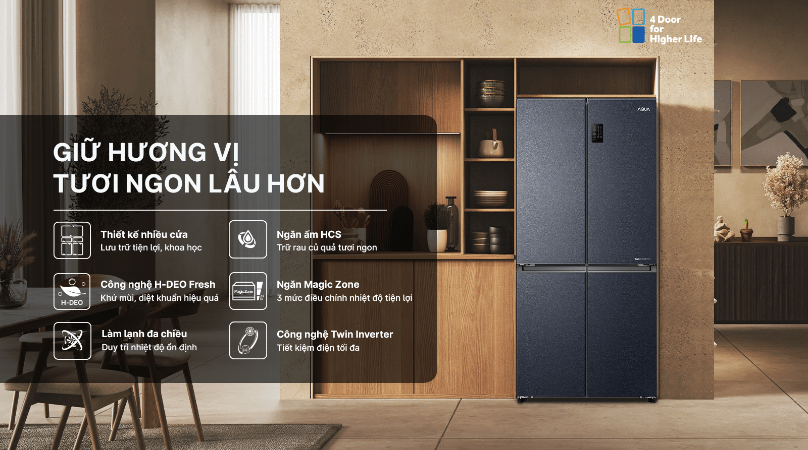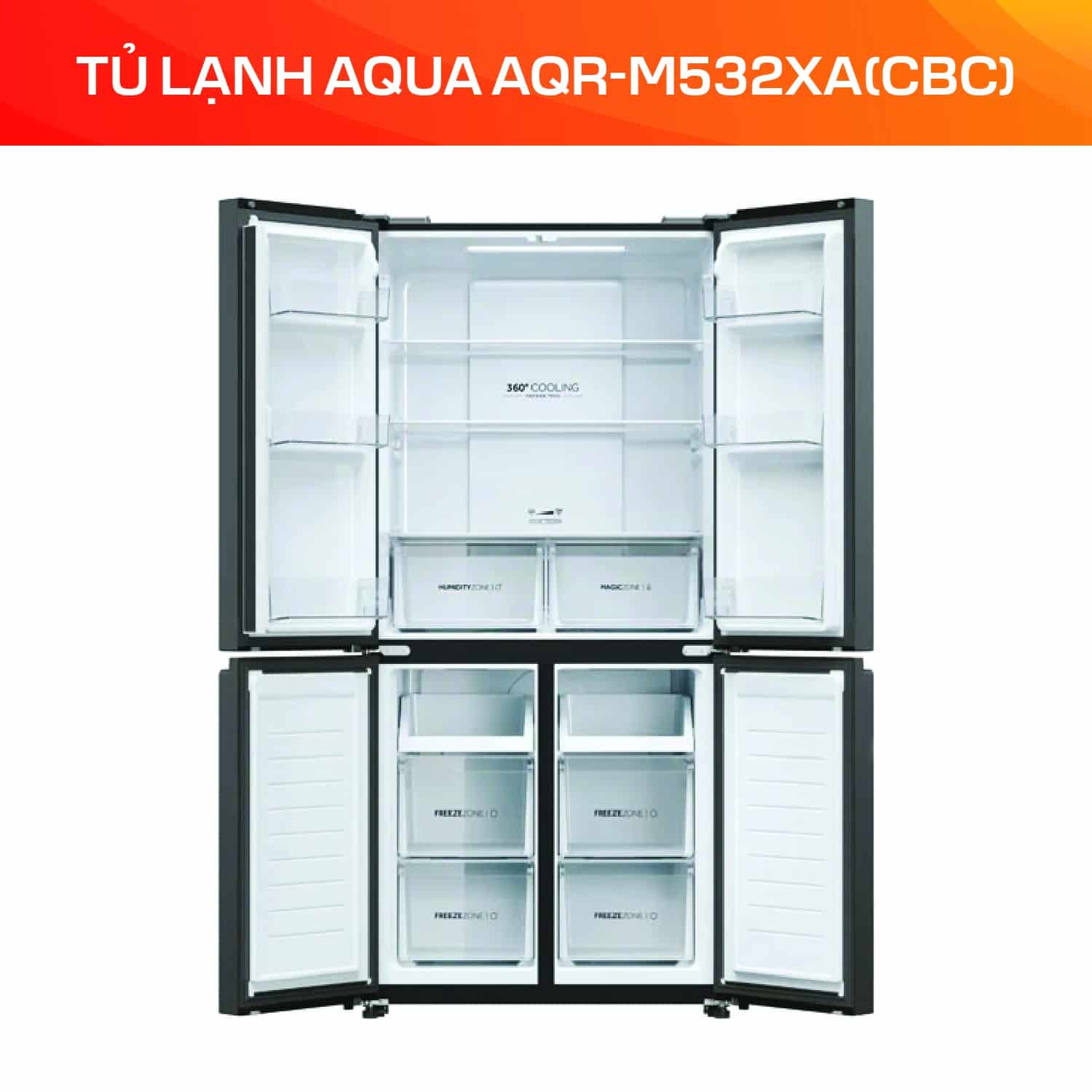 Trong phân khúc tủ lạnh 4 cửa (Multi Door) dung tích cao, TỦ LẠNH AQUA AQR-M532XA(CBC) nổi bật là lựa chọn lý tưởng cho gia đình 4–5 người. Với dung tích sử dụng lên tới 469 lít, thiết kế hiện đại, công nghệ tiết kiệm điện Twin Inverter, tính năng bảo quản thực phẩm thông minh và hệ thống khử mùi DEO Fresh / H-DEO Fresh, tủ đáp ứng tốt nhu cầu lưu trữ thực phẩm phong phú mà vẫn đảm bảo độ tươi ngon lâu dài.