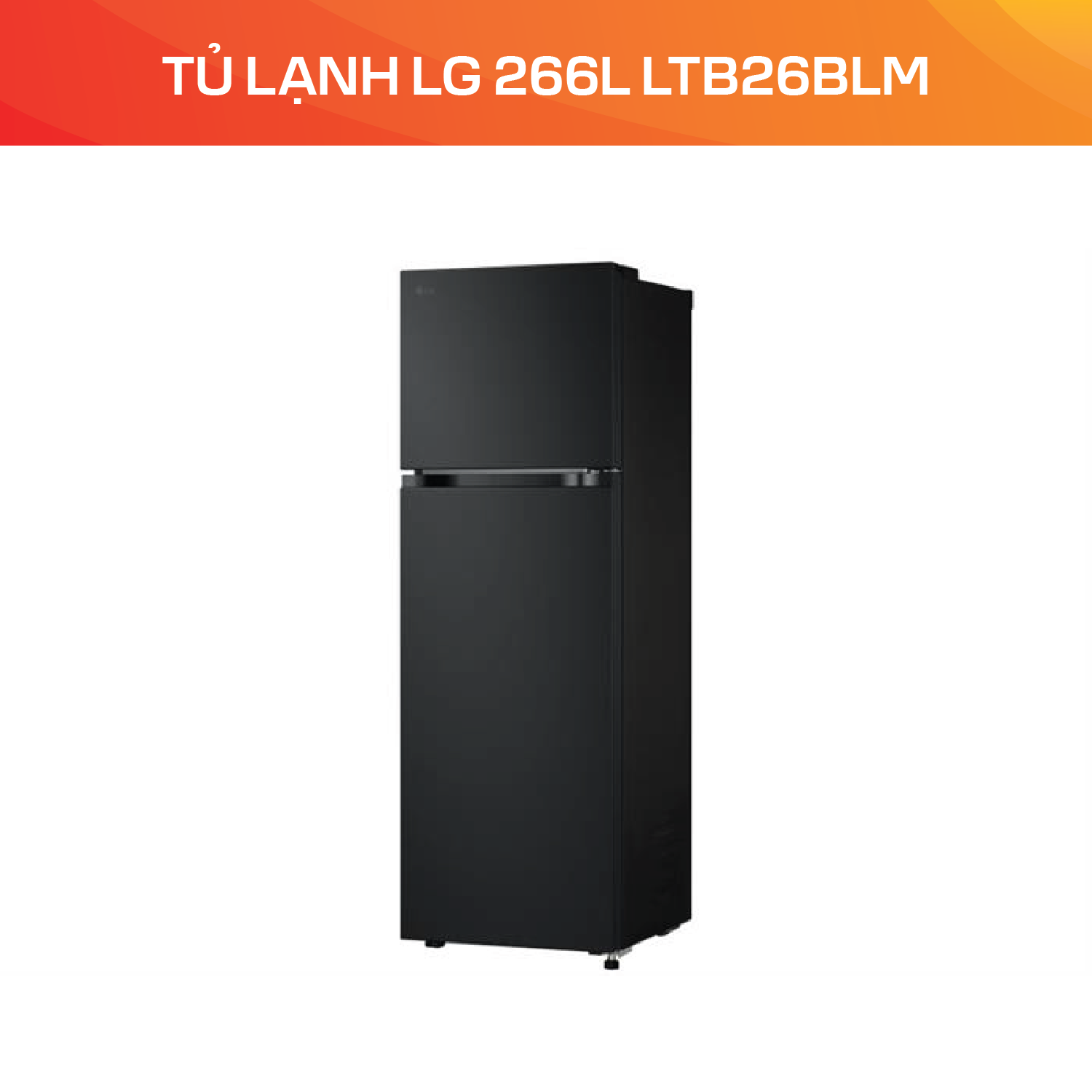 Tủ lạnh LG LTB26BLM chính hãng giá rẻ tại Hà Nội, TP.HCM. Hotline đặt hàng. Tủ lạnh LG LTB26BLM: 0988 009926, 0984 3112 30. Giao hàng toàn quốc. Tủ lạnh LG 266L LTB26BLM là dòng tủ lạnh ngăn đá trên 2 cửa của LG, có dung tích 266 lít, thiết kế nhỏ gọn, hiện đại, phù hợp cho gia đình 2–3 người. Sản phẩm được trang bị máy nén Inverter thông minh giúp tiết kiệm điện năng và vận hành êm ái, cùng công nghệ Linear Cooling™ và Multi Air Flow mang đến khả năng làm lạnh nhanh, đều và ổn định. Ngoài ra, tủ còn có ngăn bảo quản chuyên biệt 0 °C để giữ thịt cá tươi mà không cần rã đông, khay kính chịu lực bền chắc và khay đá xoay tiện lợi. Đây là mẫu tủ lạnh kết hợp giữa hiệu quả bảo quản thực phẩm, tiết kiệm điện và thiết kế sang trọng cho không gian bếp hiện đại.