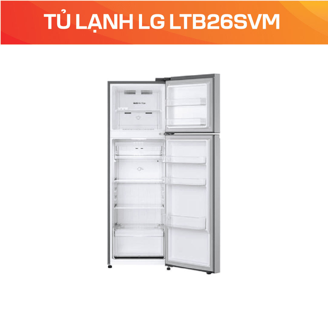 TỦ LẠNH LG LTB26SVM là dòng tủ lạnh ngăn đá trên 2 cửa của LG, có dung tích 315 lít, được trang bị công nghệ Inverter giúp tiết kiệm điện, vận hành êm ái và bền bỉ. Sản phẩm ứng dụng các công nghệ làm lạnh hiện đại như DoorCooling+™ cho khả năng làm lạnh nhanh và đồng đều, luồng khí lạnh đa chiều (Multi Air Flow) để duy trì nhiệt độ ổn định, cùng ngăn rau củ cân bằng độ ẩm, hỗ trợ bảo quản thực phẩm tươi ngon trong thời gian dài. Đây là mẫu tủ lạnh phù hợp cho các gia đình nhỏ 3–4 người, kết hợp giữa hiệu quả sử dụng và thiết kế sang trọng.