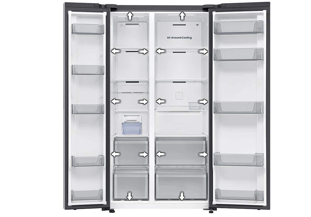 Hệ thống All-Around Cooling phân phối hơi lạnh đều khắp các ngăn thông qua nhiều cửa gió chiến lược. Điều này giúp tránh hiện tượng đồ đặt xa cửa hoặc sâu trong tủ bị thiếu lạnh hoặc mất độ tươi. Khí lạnh được cấp đều cả từ trên xuống, trái sang phải, giúp thực phẩm được làm lạnh đồng đều.