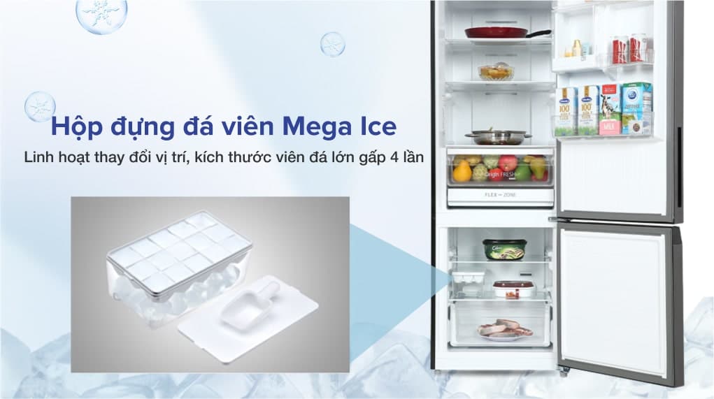 Hộp đá Mega Ice được thiết kế lớn hơn gấp bốn lần so với hộp đá thông thường. Với nắp đậy kín, đá không bị lẫn mùi thực phẩm. Hộp đá di động cho phép bạn linh hoạt đặt hộp đá ở vị trí bất kỳ trong ngăn đá để dễ thao tác và vệ sinh.